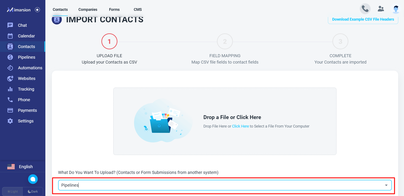- Choose your pipeline option from drop downs (What Do You Want To Upload?)